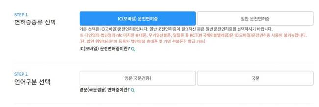 다음 단계에서는 면허증 종류를 선택합니다. IC 운전면허증과 일반 운전면허증 중 선택할 수 있으며, IC 운전면허증은 휴대폰과 연동해 사용할 수 있어 편리하지만 비용이 다소 높습니다. 일반 면허증은 비용이 낮아 경제적입니다.
